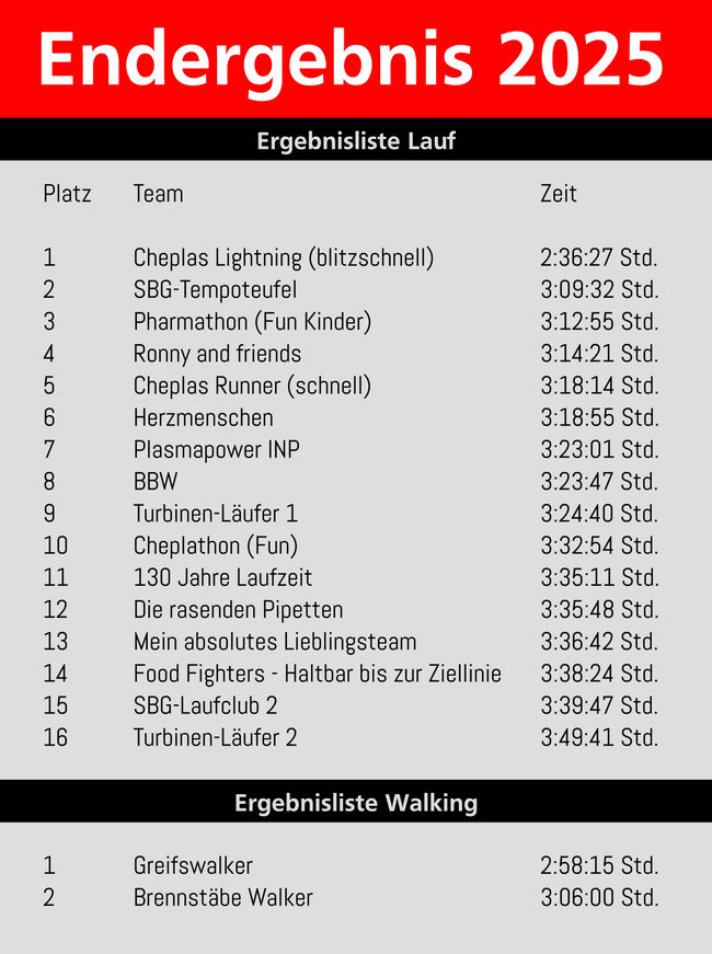 Nach dem gemeinsamen Start aller Läufer*innen und Walker*innen wechselten sich die Aktiven eines Teams nach jedem gelaufenen oder gewalkten Kilometer ab bis nach 105 und eine halbe Runde die Marathondistanz gemeinsam absolviert wurde. Das Team „Cheplas Lightning“ der Cheplapharm Arzneimittel GmbH, die mit insgesamt vier Laufteams und 72 Läuferinnen und Läufern am Spenden-Marathon teilnahm, übernahm von Beginn an die Führung, baute diese Kilometer um Kilometer aus und siegte am Ende mit Bestzeit und großem Vorsprung nach sehr guten 2:36:27 Std. Auf den Plätzen 2 bis 4 ging es wesentlich spannender zu. Die Laufteams „Ronny and friends“, „Tempoteufel“ und „Pharmaton“, Cheplapharms Nachwuchs-Team, lagen bis etwa Kilometer 30 3ng beieinander. Am Ende sicherten sich die „Tempoteufel“ des SBG-Laufclubs nach 3:09:32 Std. den 2. Platz. Auf den Plätzen 3 und 4 liefen die „Pharmatons“ (3:12:55) und „Ronnx and friends“ (3:14:21) ins Ziel.