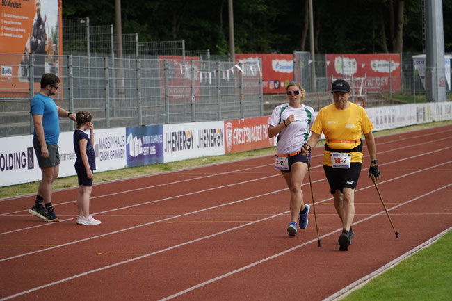 Beim Walking-Halbmarathon war das Familienteam ThüRo mit 2:53:42 Std. nur etwas schneller unterwegs als die Brennstäbe-Walker der EWN Lubmin, die nach 3:00:03 Std. gemeinsam die Ziellinie